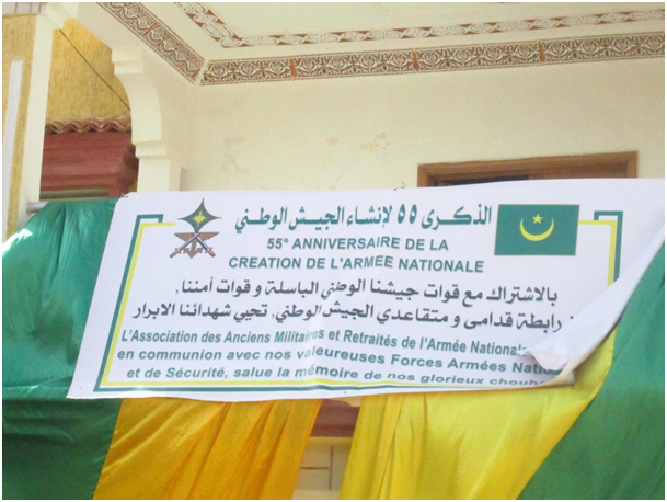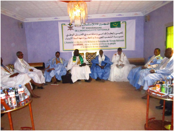 A l’occasion des commémorations des 25 et 28 novembre, respectivement, création de l’Armée Nationale et l’accession de notre cher pays à la souveraineté nationale et internationale, l’Association des Anciens Militaires et Retraités de l’Armée Nationale (AAMRAN) adresse ses vives félicitations à Monsieur le Président de la République Chef Suprême des Forces Armées, Son Excellence Mohamed Ould Abdel Aziz, et à travers lui à l’ensemble de la Nation, à l’Etat-major Général des Armées et aux Forces Armées et de Sécurité, pour la démonstration triomphale de professionnalisme illustré par le défilé magnifique auquel ont pris part des éléments de forces armées de pays frères et amis du voisinage, suscitant l’admiration de tous les patriotes.